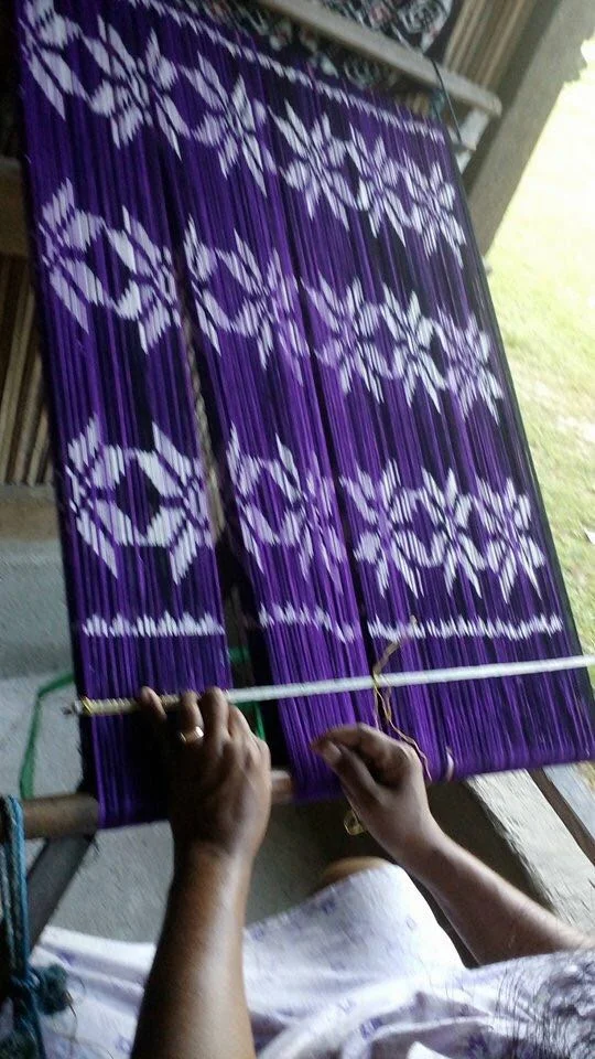 Our accessories collection mixes faux leather, or leather with traditional handwoven ikat fabrics. The ikat involves binding multiple strands of yarn into a tight wrapping that is then dyed with a selected traditional pattern. This is all before the yarns are woven into cloth.